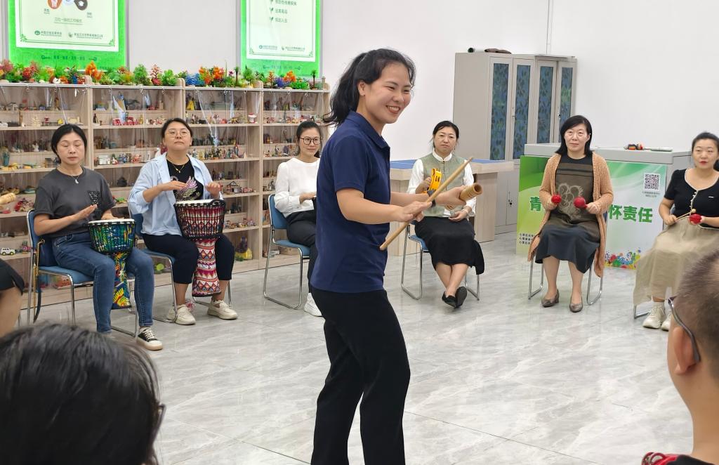 教职工围坐成圈,各自选择手鼓、沙锤等乐器。在霍东杰的引导下,大家从最初的试探性敲击,逐渐找到属于自己的节奏,不同乐器的声音相互交织,原本零散的节拍慢慢汇聚成和谐的集体韵律。过程中,有人随着节奏轻轻晃动身体,有人在敲击重音时不自觉舒展眉头,原本略带拘谨的氛围,在一次次“鼓音对话”中变得轻松热烈。