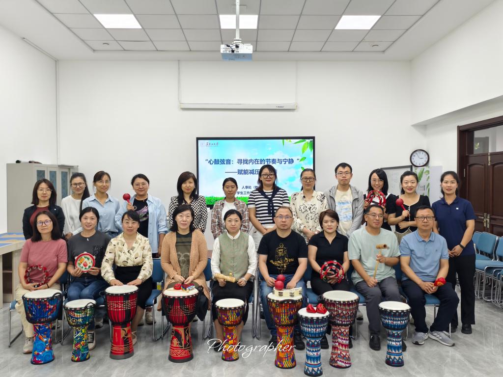 值此教师节之际,为帮助教职工在音乐共鸣中释放压力、调节情绪,以更饱满的身心状态投入育人工作,9月12日14时,人事处(教师工作部)与学生工作部(学生处、武装部)联合举办“品重懿范立德树人——师德・文化大讲堂”体验课堂第二十一期之“心鼓弦音:寻找内在的节奏与宁静”赋能减压工作坊。活动由黑龙江大学心理健康教育中心专职教师霍东杰带领,吕慧杰协同带领,共吸引20名教职工参与。