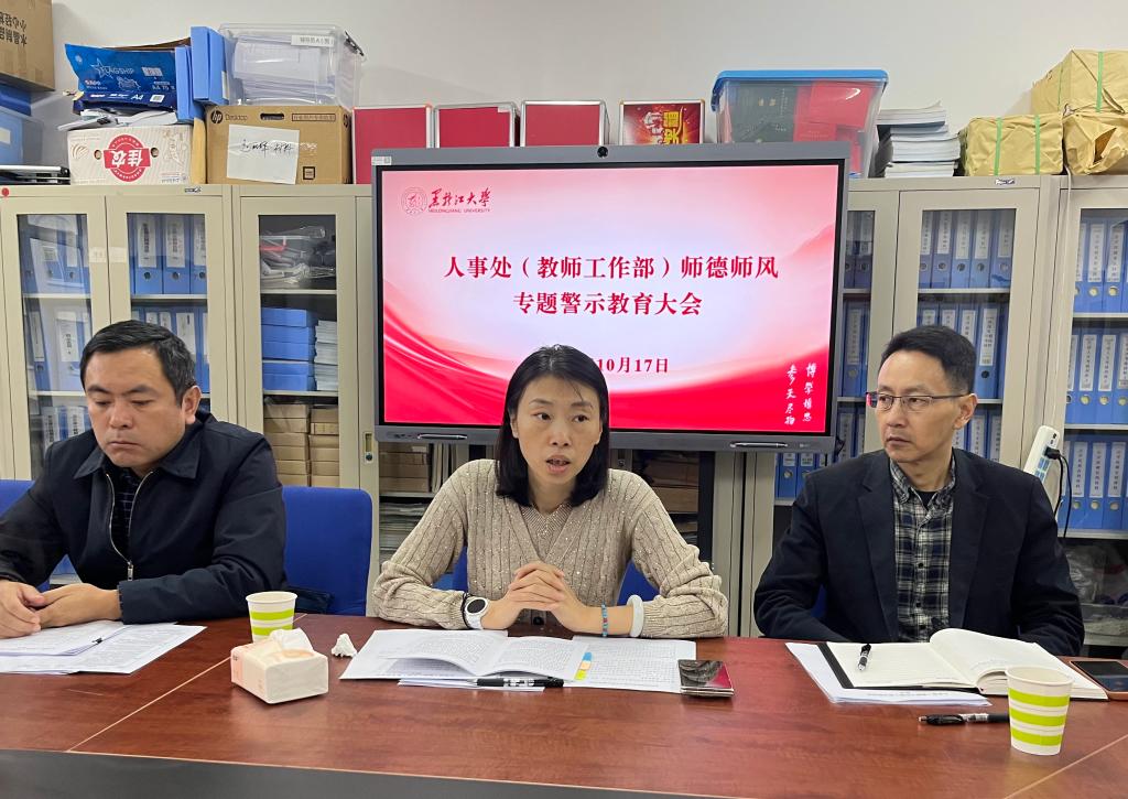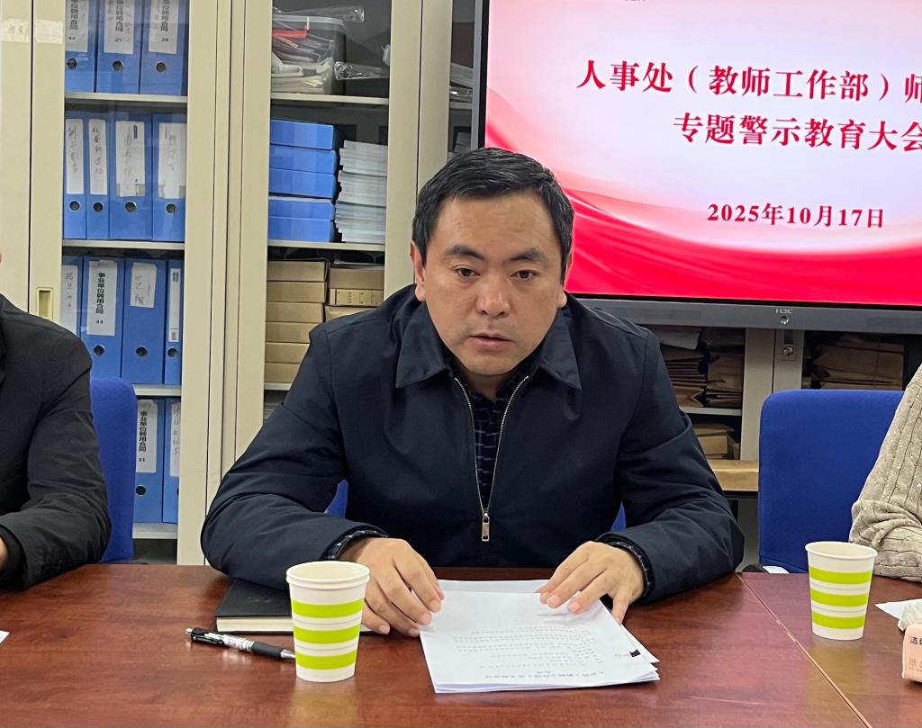 为深入贯彻落实师德师风建设长效机制,切实筑牢教职工思想道德和行为规范防线,10月17日上午8:00,人事处(教师工作部)党支部在主楼A320召开师德师风专题学习暨警示教育大会。会议由人事处(教师工作部)党支部书记张晶平主持,学校党委副书记、副校长三朗扎西、人事处(教师工作部)党支部全体党员参会。