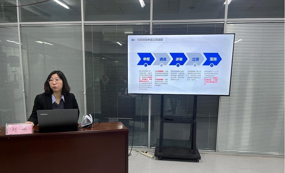 创新创业教育学院(创新创业教育中心)创新创业教研室主任吴昊主要对创新创业教育“‘课-项-赛’一体化”进行系统介绍,包括创新创业课程内容与实际项目开发、学科竞赛需求精准对接,以及该体系在培养学生创新思维、实践能力方面的显著成效,为新教师在创新创业教育领域的发展提供了思路和方法。社会科学处副处长张博从国家政策、学校科研政策等方面进行了讲解,重点介绍了社科项目申报的流程、要求和注意事项,以及学校对社科科研的支持措施;科学技术处项目管理科科长赵曦详细说明了科技项目申报及学校科研政策,包括纵向科研项目概况、申报立项流程以及纵向科研经费使用相关管理办法等,为新教师开展科研工作提供了具体的指导。