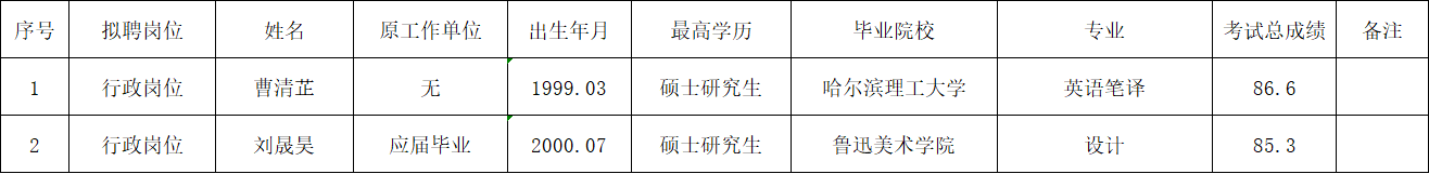 根据《黑龙江省清史研究院公开招聘工作人员(劳务派遣)公告》要求,现将拟聘用人员予以公示,公示期7个工作日。如有异议,请在公示期内实名反映。反映情况和问题必须实事求是,应签署或告知真实姓名、工作单位和联系方式;对线索不清的匿名信和匿名电话,不予受理;逾期反映情况不予受理。