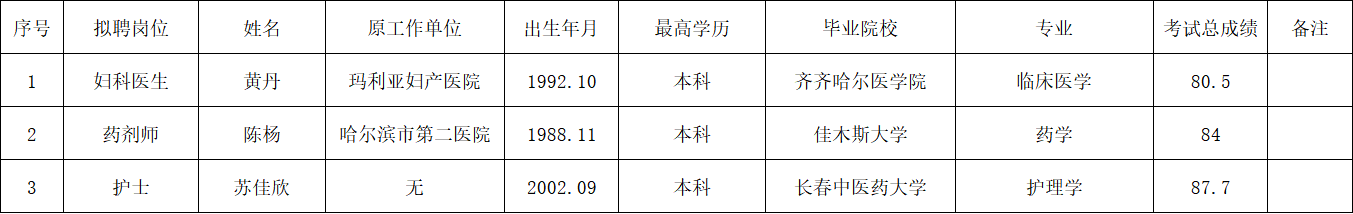 根据《黑龙江大学校医院公开招聘卫生专业技术人员(劳务派遣)公告》要求,现将拟聘用人员予以公示,公示期7个工作日。如有异议,请在公示期内实名反映。反映情况和问题必须实事求是,应签署或告知真实姓名、工作单位和联系方式;对线索不清的匿名信和匿名电话,不予受理;逾期反映情况不予受理。